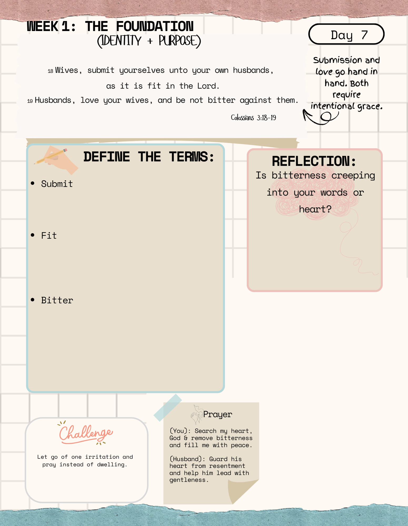 Each day explores a different aspect of biblical womanhood: submission, respect, unity, communication, endurance... and invites you to let God shape your heart, not just your habits. Whether you’ve been married five months or fifty years, this study will help you build a marriage anchored in truth and overflowing with grace.